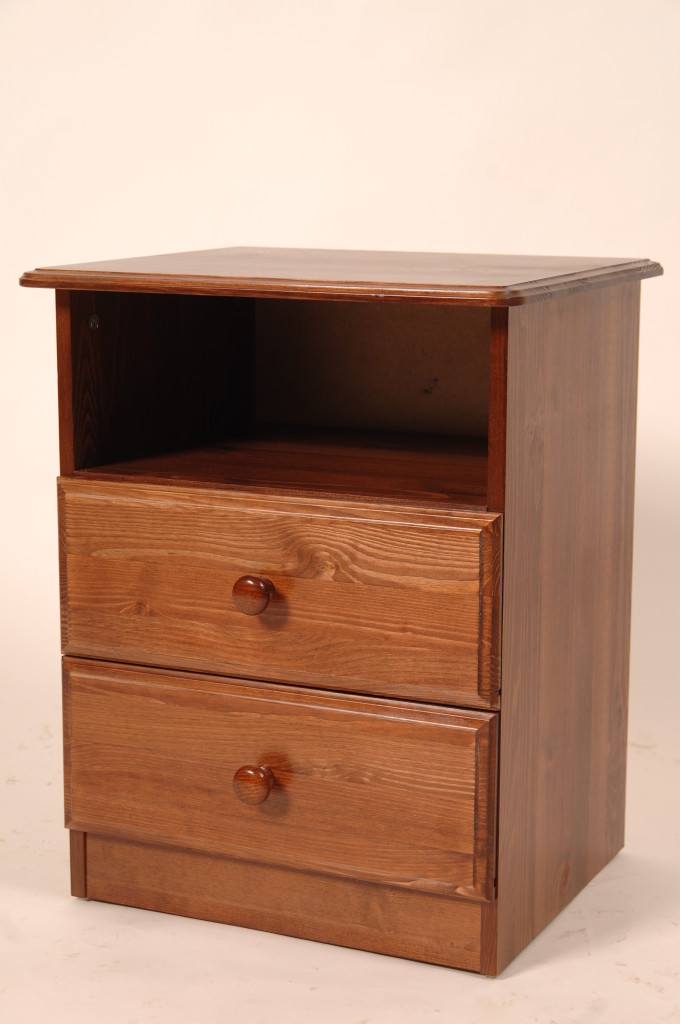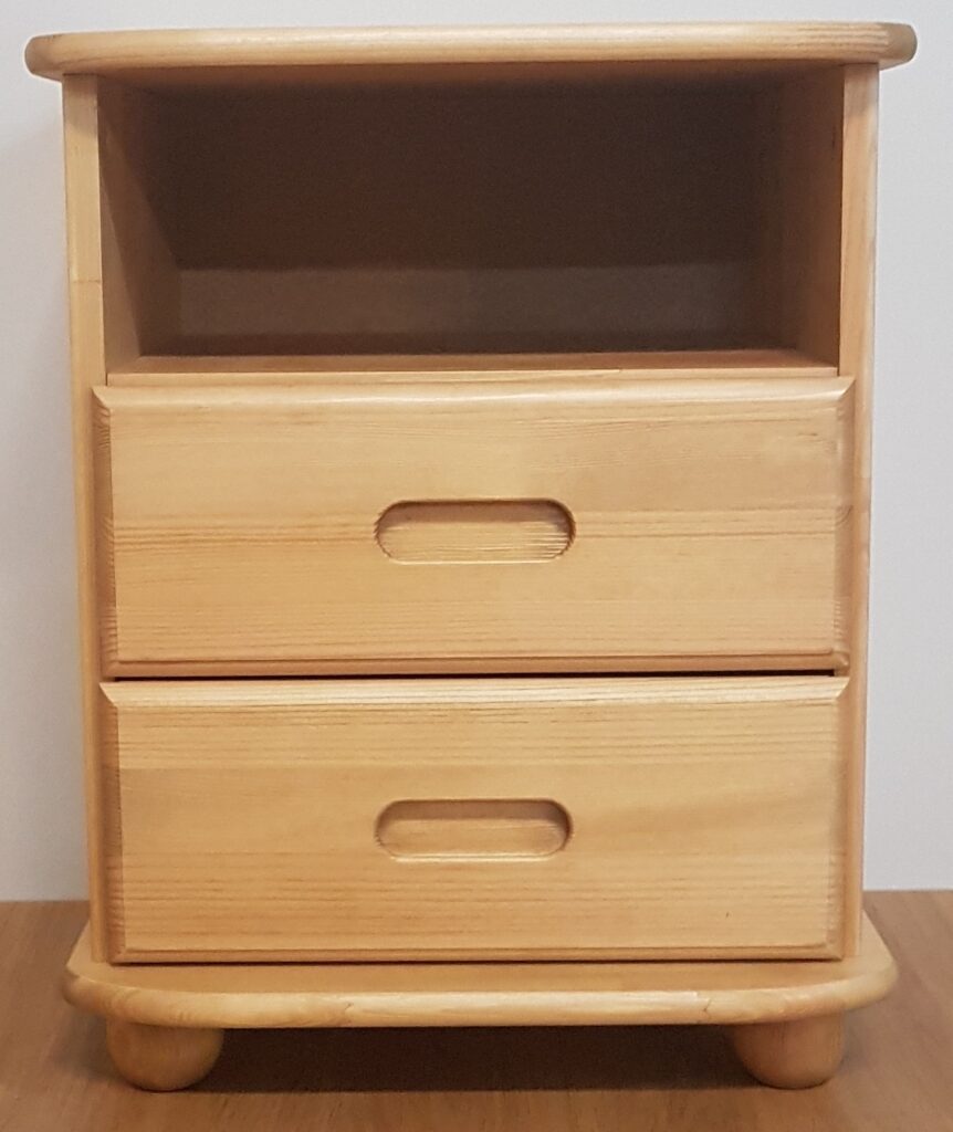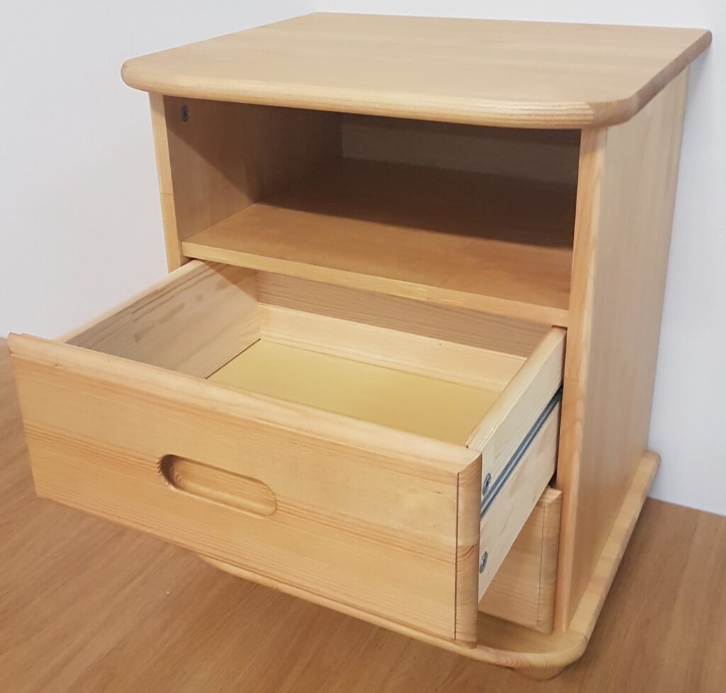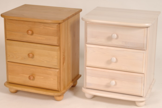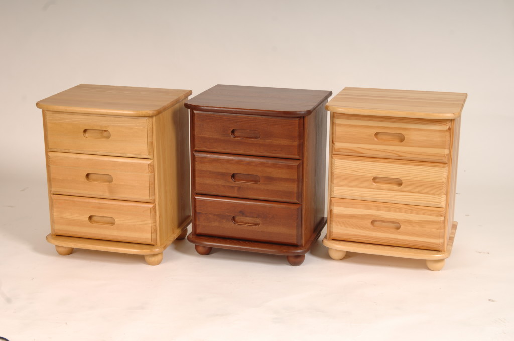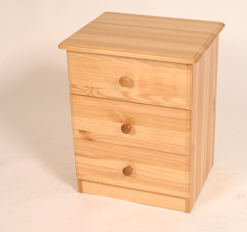 Ett nattduksbord i naturlig furu med trähandtag och tre lådor blir större vad gäller kapacitet och du kommer att kunna